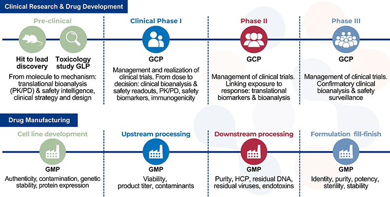 The development of biologics, including therapeutic antibodies such as Antibody Drug Conjugates (ADC), bispecific antibodies, recombinant proteins, conjugates, and emerging biotherapeutic platforms, requires end-to-end expertise covering advanced bioanalytical characterisation and high-quality bioanalysis during drug development, as well as GMP controls during the manufacturing process. To meet rising expectations for speed, scientific precision, and seamless coordination across R&D programmes, Eurofins offers an integrated solution built on the combined strengths of three complementary entities: Eurofins Optimed, a clinical centre and CRO; Eurofins ADME Bioanalyses, a leading expert in bioanalysis, pharmacokinetics, and immunogenicity; and Eurofins BPT Biologics, specialised in GMP testing in biologics manufacturing. Together, they create a unique technical continuum that supports biotech and pharmaceutical developers from preclinical GLP and early clinical trials, to late phase clinical GCLP stages. In parallel, they deliver controlled, reproducible production to help clients ensure their biologic drug is safe, pure, potent, and consistently produced.